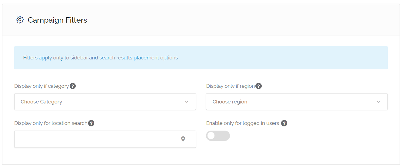 Select if the ad should only appear for a specific category or region.Optionally, limit the ad display by radius (you must have the Radius Search configured in Listeo Core → Map Options).Ads can also be limited to logged-in users only.