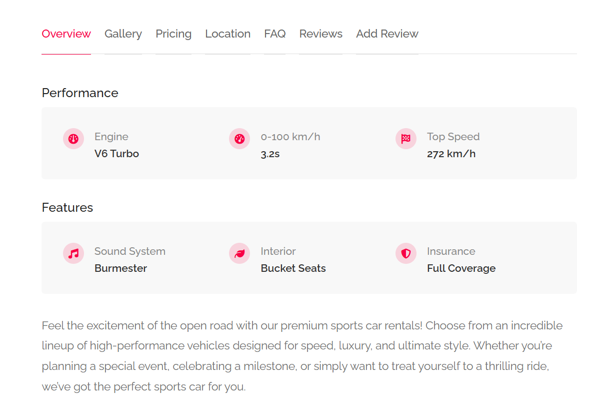 You can create custom fields, group and display them in listing overview for each category. Those fields will be also available in search forms editor so you will be able to create search form filters for your custom fields.