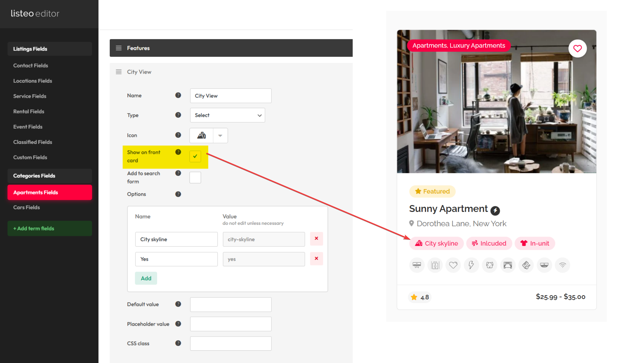 First you need to create custom fields for listing type you want in fields customizer in Listeo Editor → Fields