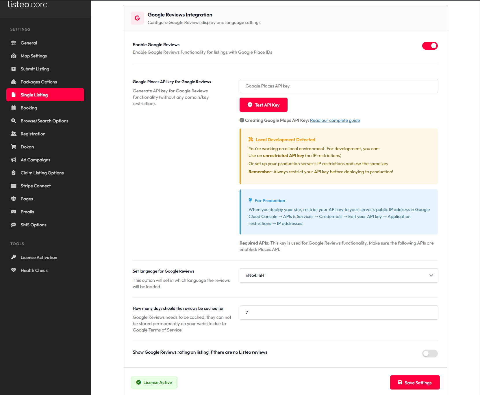 - First make sure you Google API key is properly created (not restricted to domain). In Listeo Core → Single Listing → Google Reviews Integration click “Test your API key“.