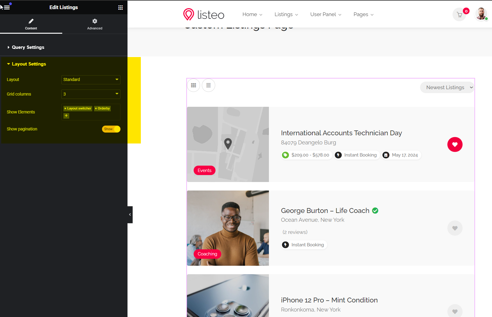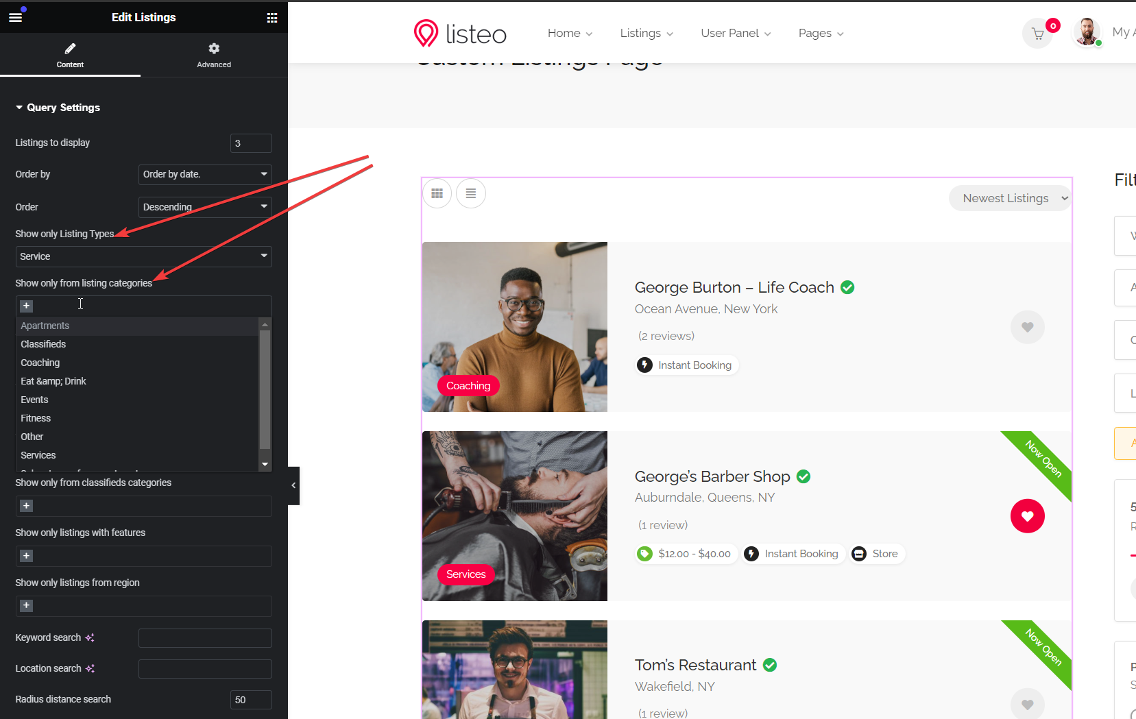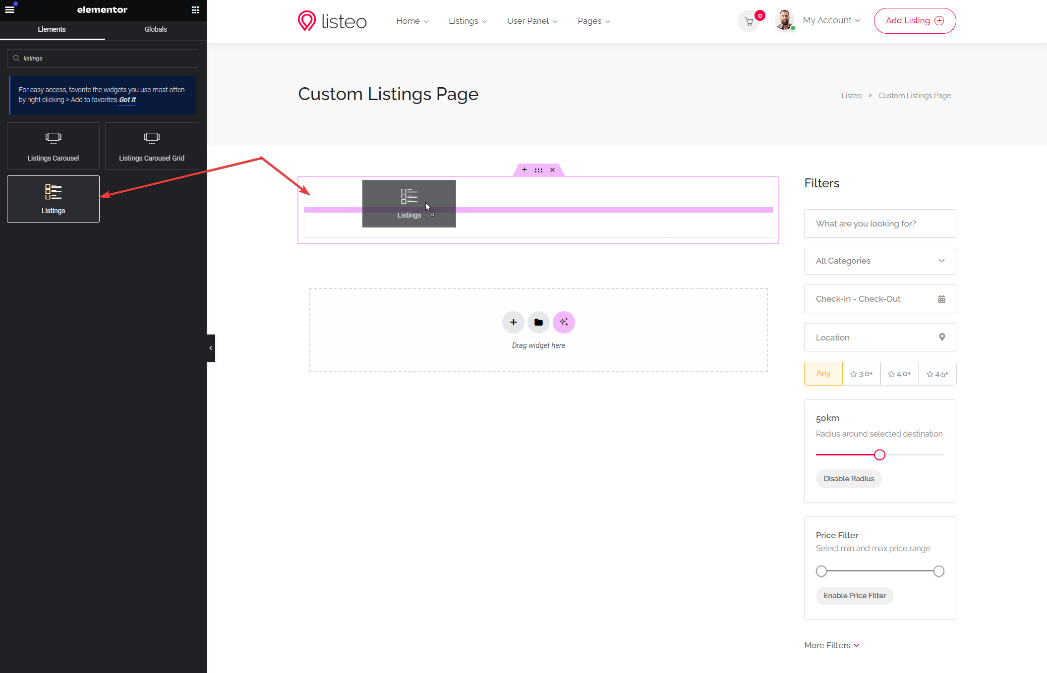 Add “Listings” widget