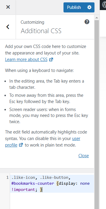 HomeKnowledge Base for ListeoHow-To Guides How to remove bookmarks functionality? If you would like to remove bookmarks functionality: Add this custom CSS snippet in Customize → Additional CSS: .like-icon, .like-button, #bookmarks-counter, .like-button-notlogged {display: none !important; } Disable bookmarks page in Listeo Core → Pages