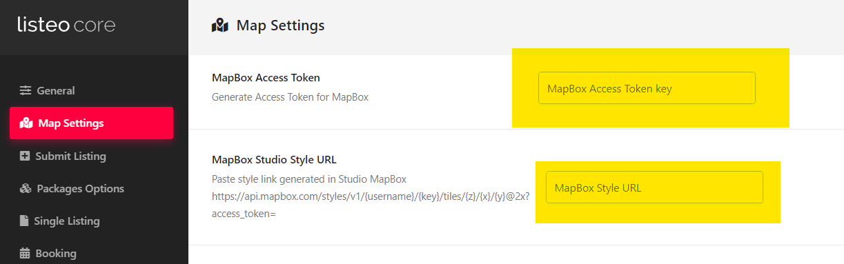 Next, go to Listeo Core and paste “Access token” into “MapBox Access Token” field.