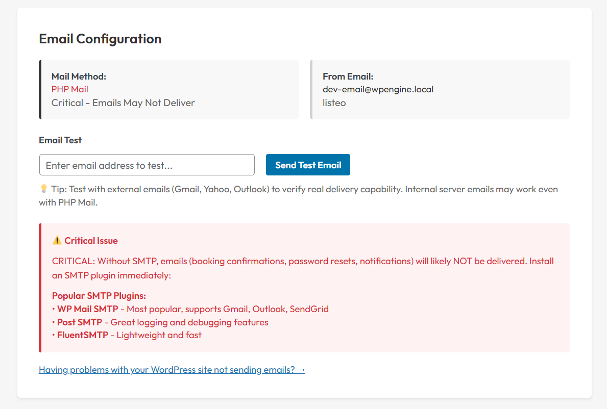 Monitors email delivery method and provides testing tools. PHP Mail method is unreliable – install an SMTP plugin for better delivery.