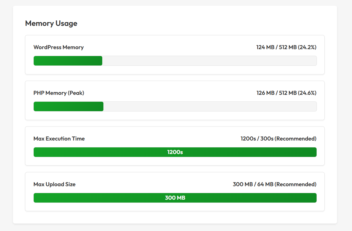 Tracks server resource consumption including WordPress memory, PHP memory, execution time, and upload limits. Visual bars show usage percentages.