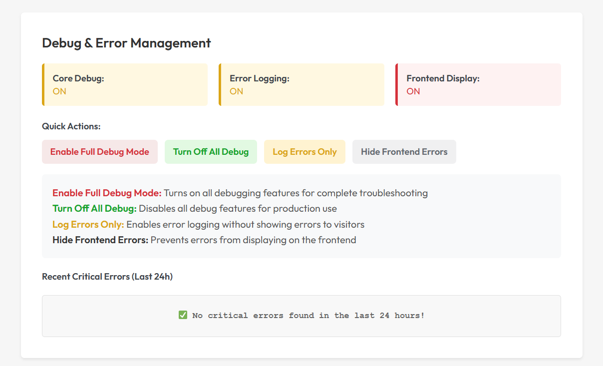 - Hide Frontend Errors – Prevents visitor-facing error messages