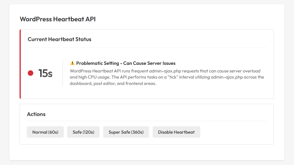 WordPress Heartbeat API runs frequent admin-ajax.php requests that can cause server overload and high CPU usage. The API performs tasks on a “tick” interval utilizing admin-ajax.php across the dashboard, post editor, and frontend areas.