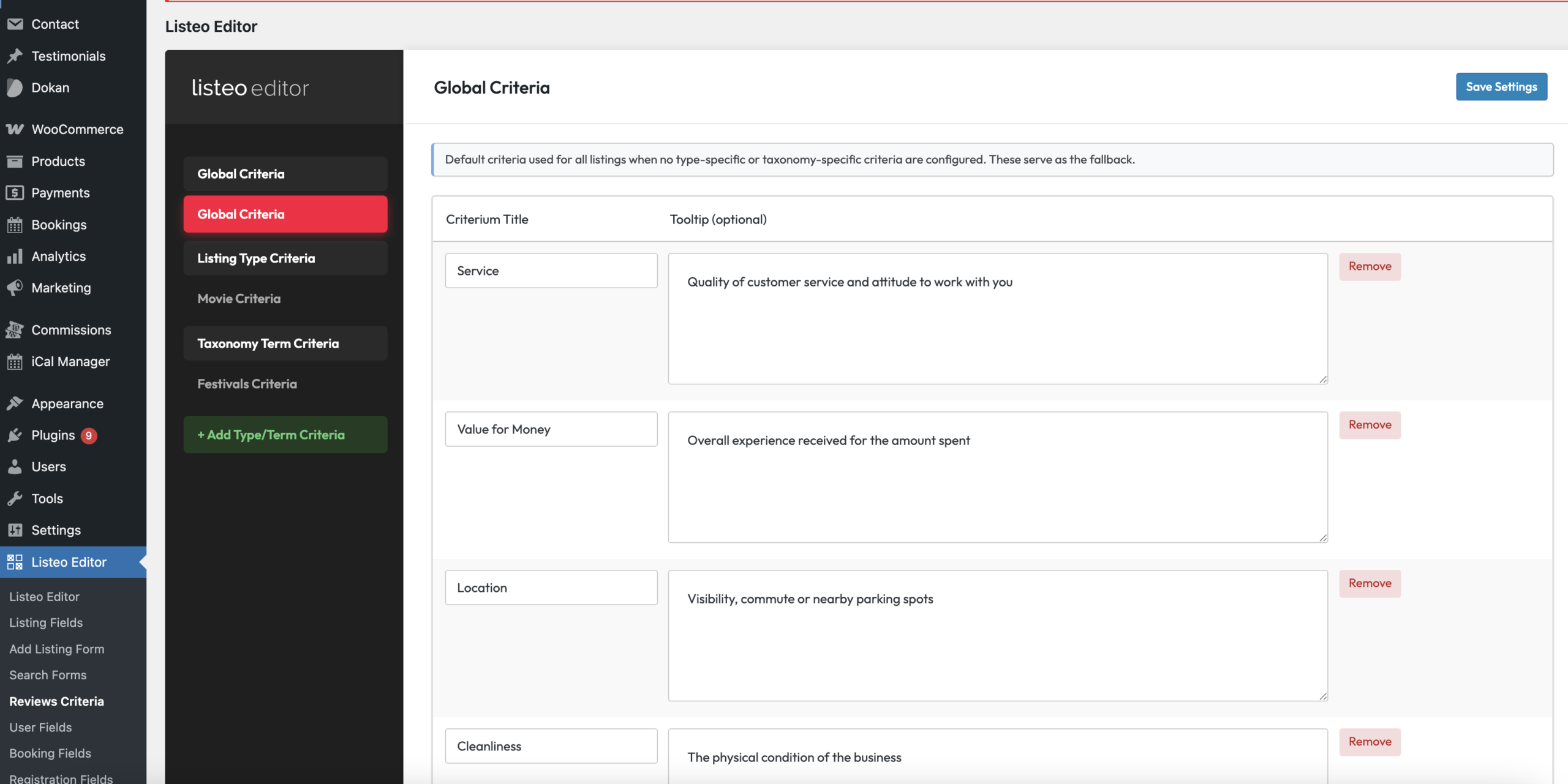 You can configure multi-criteria ratings in Dashboard → Listeo Editor. Tooltips are optional, but it’s good practice to provide a short description for each criterion.