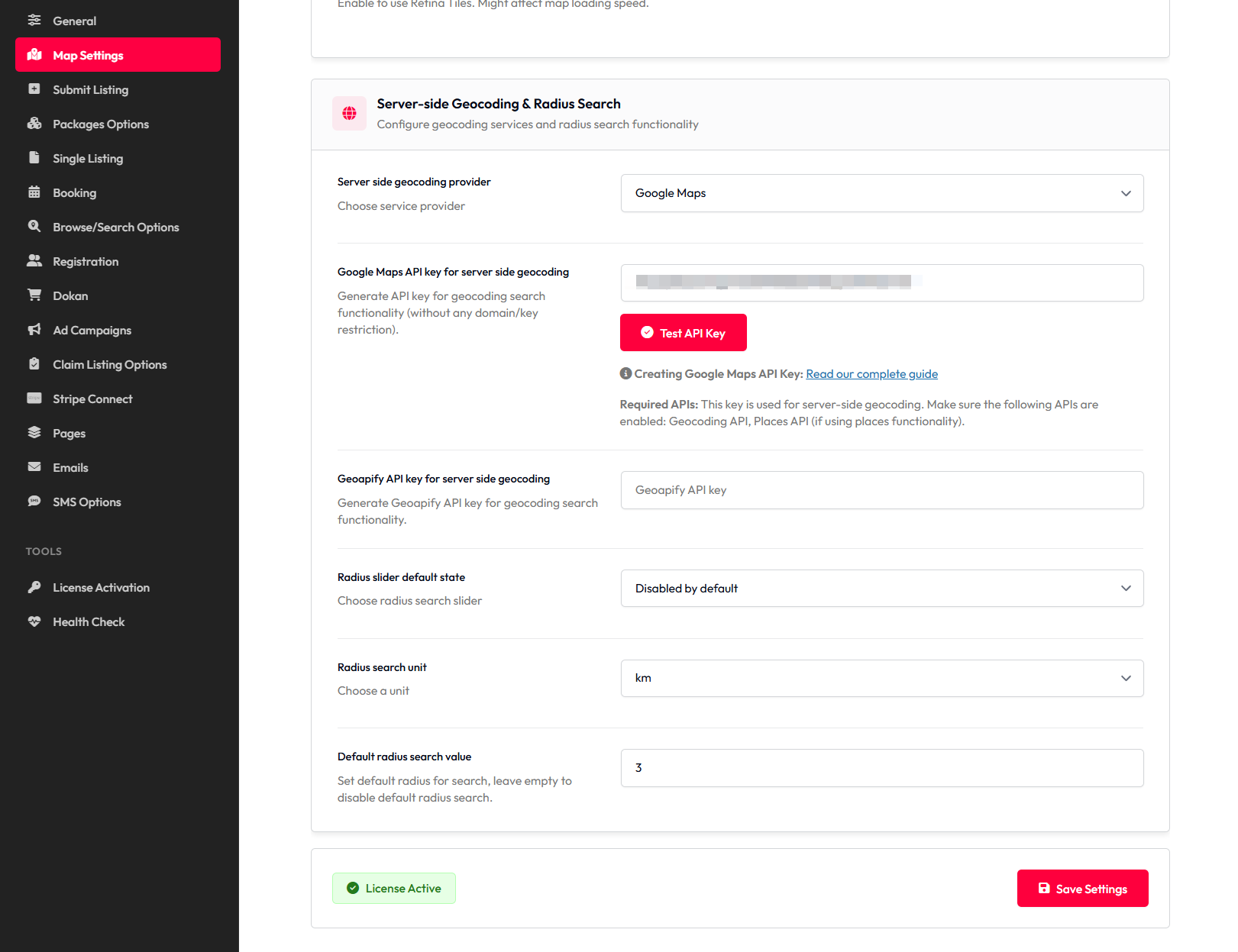 Once you created new API Key, paste it to Listeo Core → Map Settings → Server-side Geocoding & Radius Search