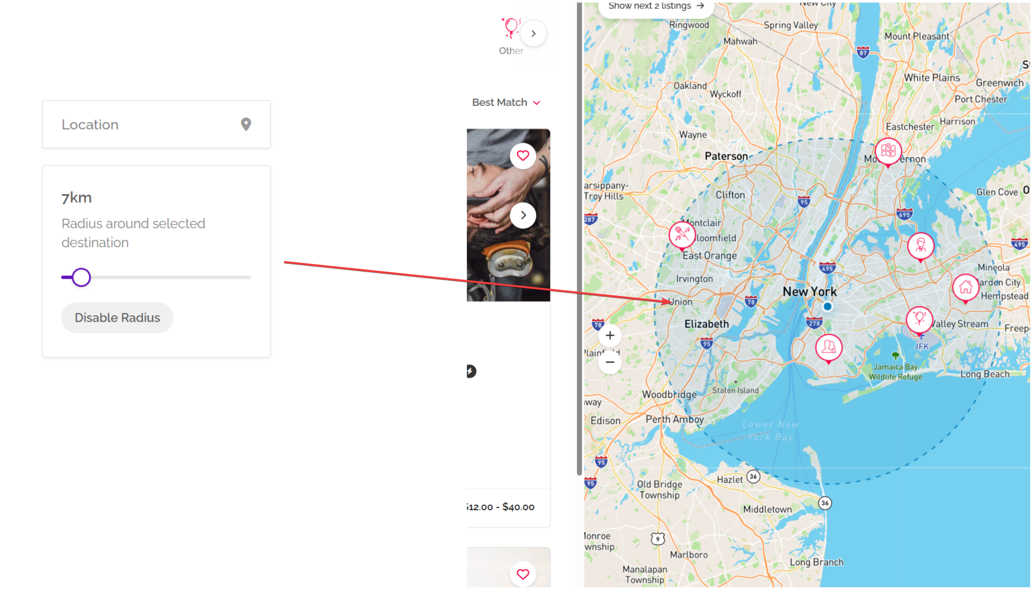 How it works? If someone types keyword/location field, and select a distance value, the address will be geocoded to latitude and longitude and all properties that are in the selected radius of that point are returned in search results.