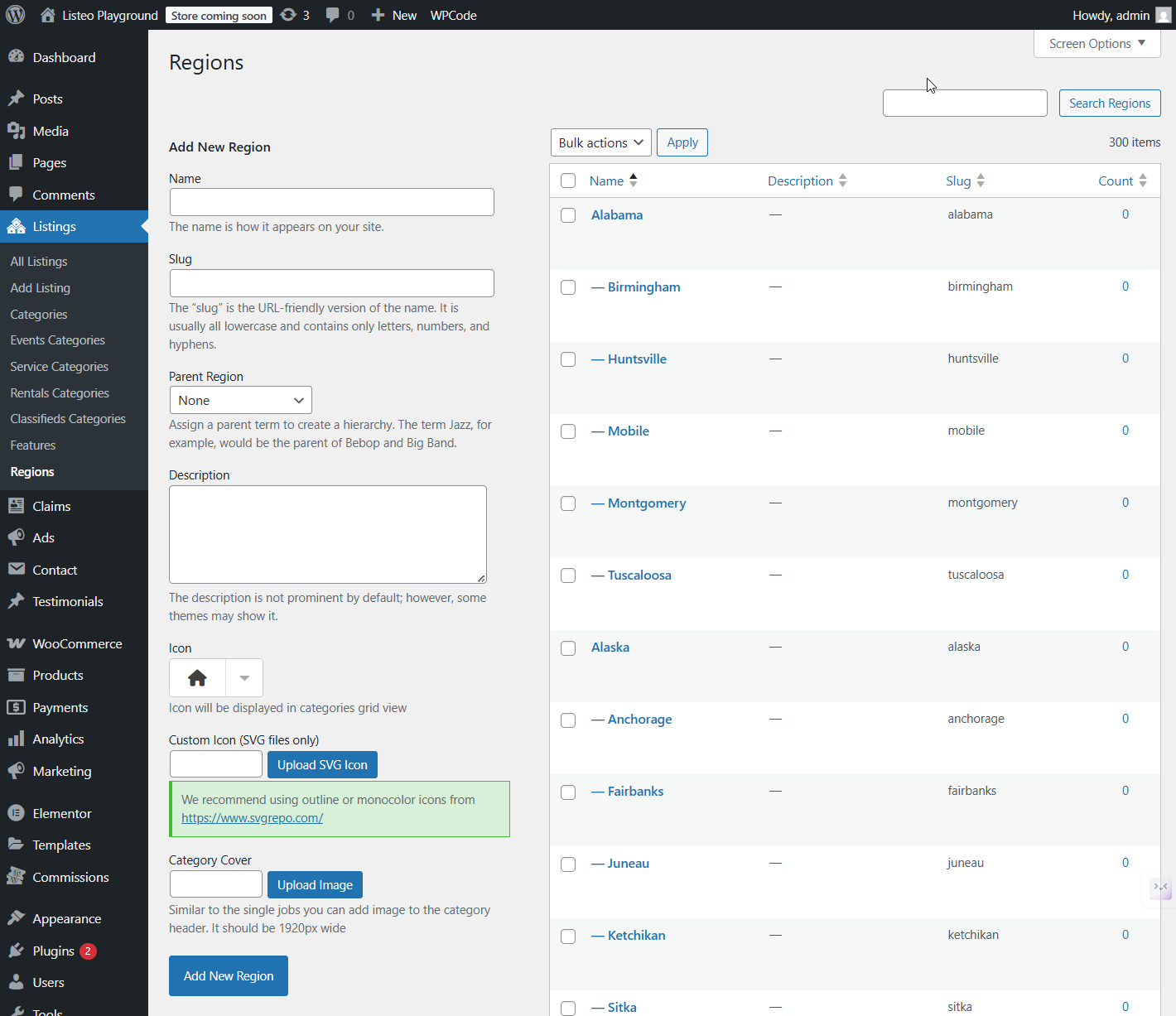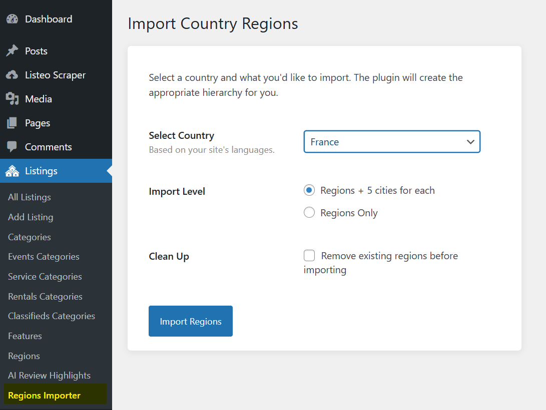Click Import Regions, wait a minute or two and done. - The page will refresh with a success message. You can now find all your new regions and cities under your ‘Regions’ taxonomy in Listings → Regions).
