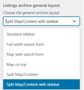 Listings Archive General Layout | Layout for the archive page. | Split Map/Content | N/A |