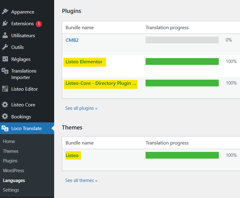 - To do that, install Loco Translate, then go to Loco Translate → Languages and select either the Listeo theme or the Listeo Core + Listeo Elementor plugins (translations are split between them).