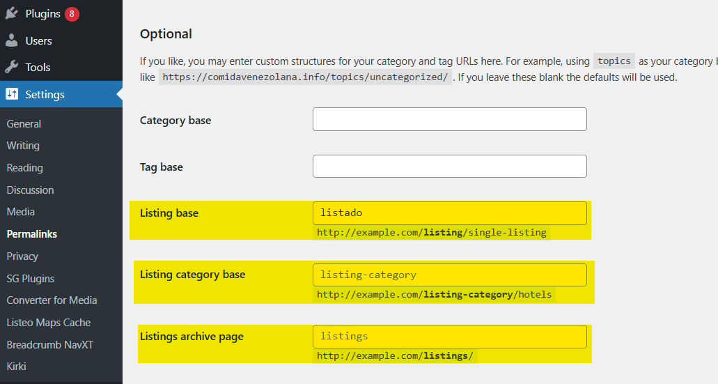 - Important! Add translated URL titles in Settings → Permalinks for Listings base – otherwise listing pages might lead to 404 error page.
