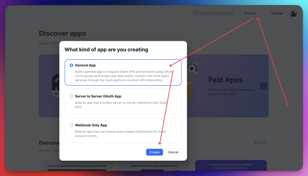 Go to the Zoom App Marketplace and sign in with your Zoom account. Click Develop in the top-right corner, then Build App. In the popup, select General App (the default option).