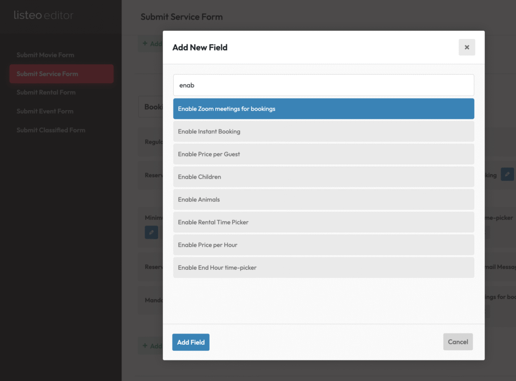 - Add the field Enable Zoom meetings for bookings (checkbox type)