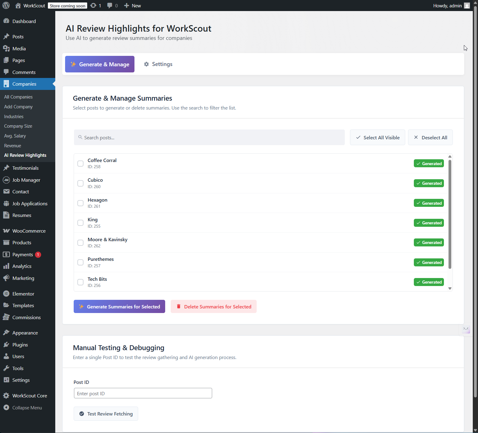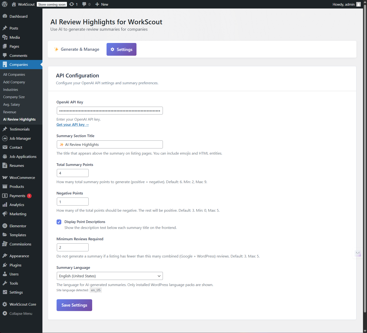- Upload ai-review-highlights-for-workscout.zip in WP Dashboard → Plugin → Add New and install & activate.