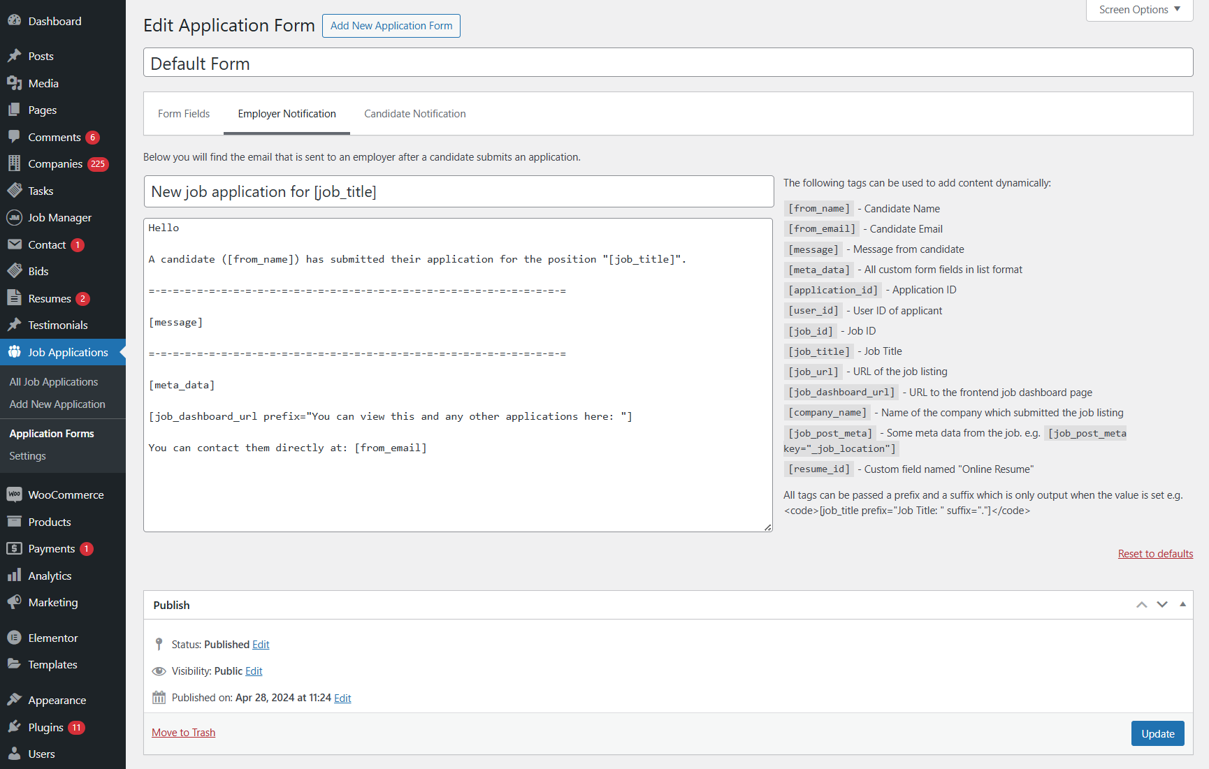 From the form editor page, you will also notice 2 tabs at the top to customise the notifications. By default, only an employer notification is sent, but if you add content to the candidate notification, candidates will be notified too.