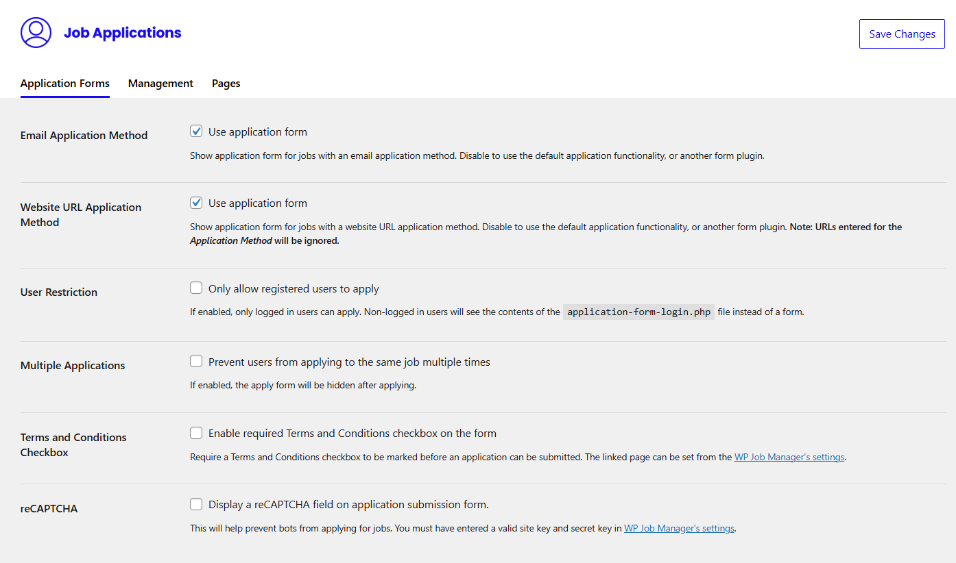 - ReCAPTCHA â This will help prevent bots from applying for jobs. You must have entered a valid site key and secret key in WP Job Managerâs settings.