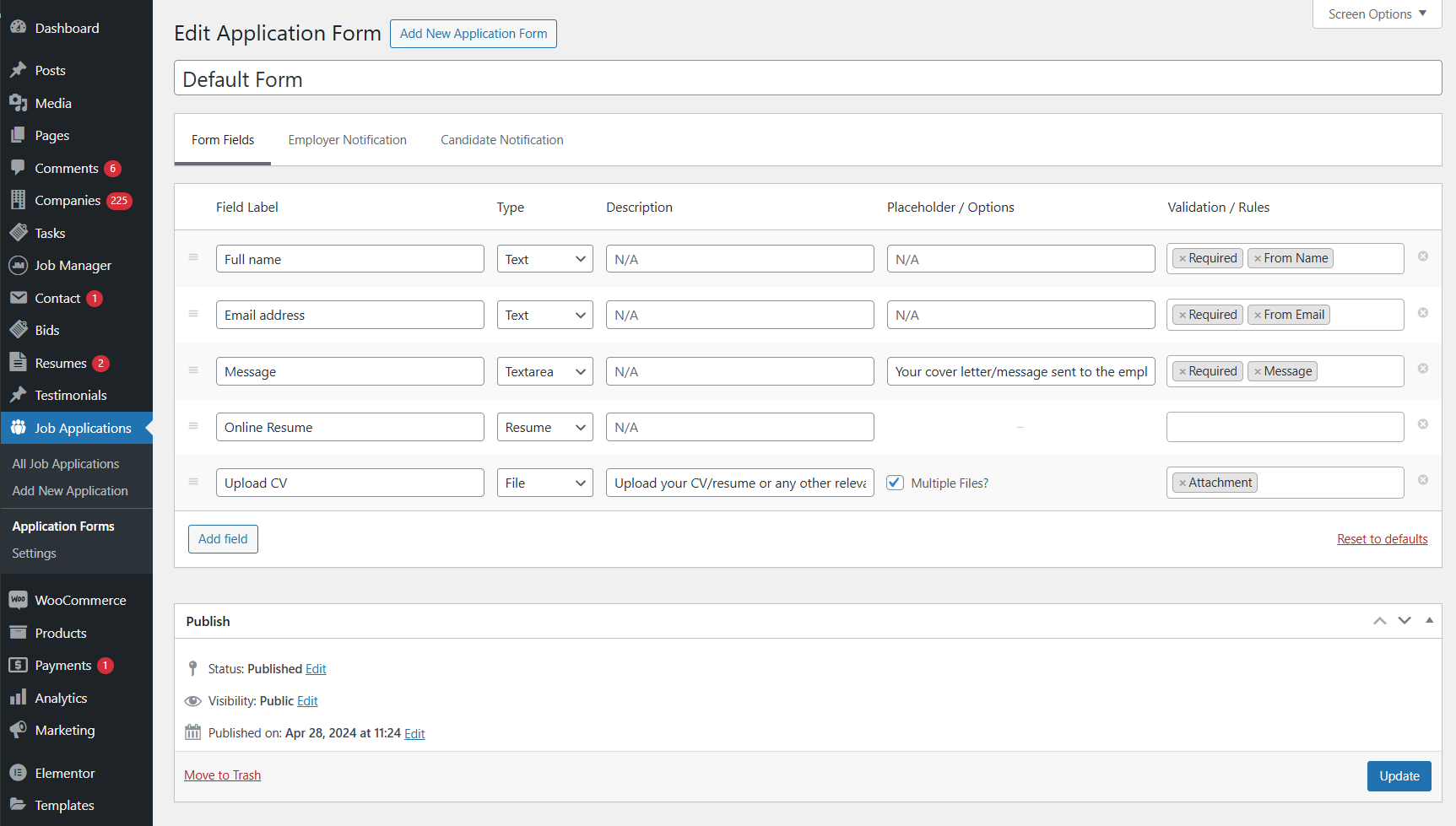 In the WordPress admin dashboard youâll see a new section called Job Applications. Going here, as an admin user, youâll see all applications: