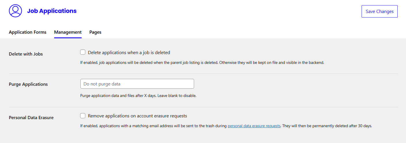 - Delete with Jobs â Delete applications when a job is deleted â If enabled, job applications will be deleted when the parent job listing is deleted. Otherwise, they will be kept on file and visible in the backend.
