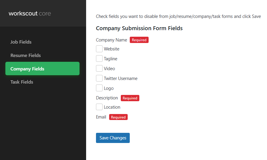 Basic changes can be done in WorkScout Core → Form Fields Visibility → Company Fields where you can enable or disable fields you want in company submit form.