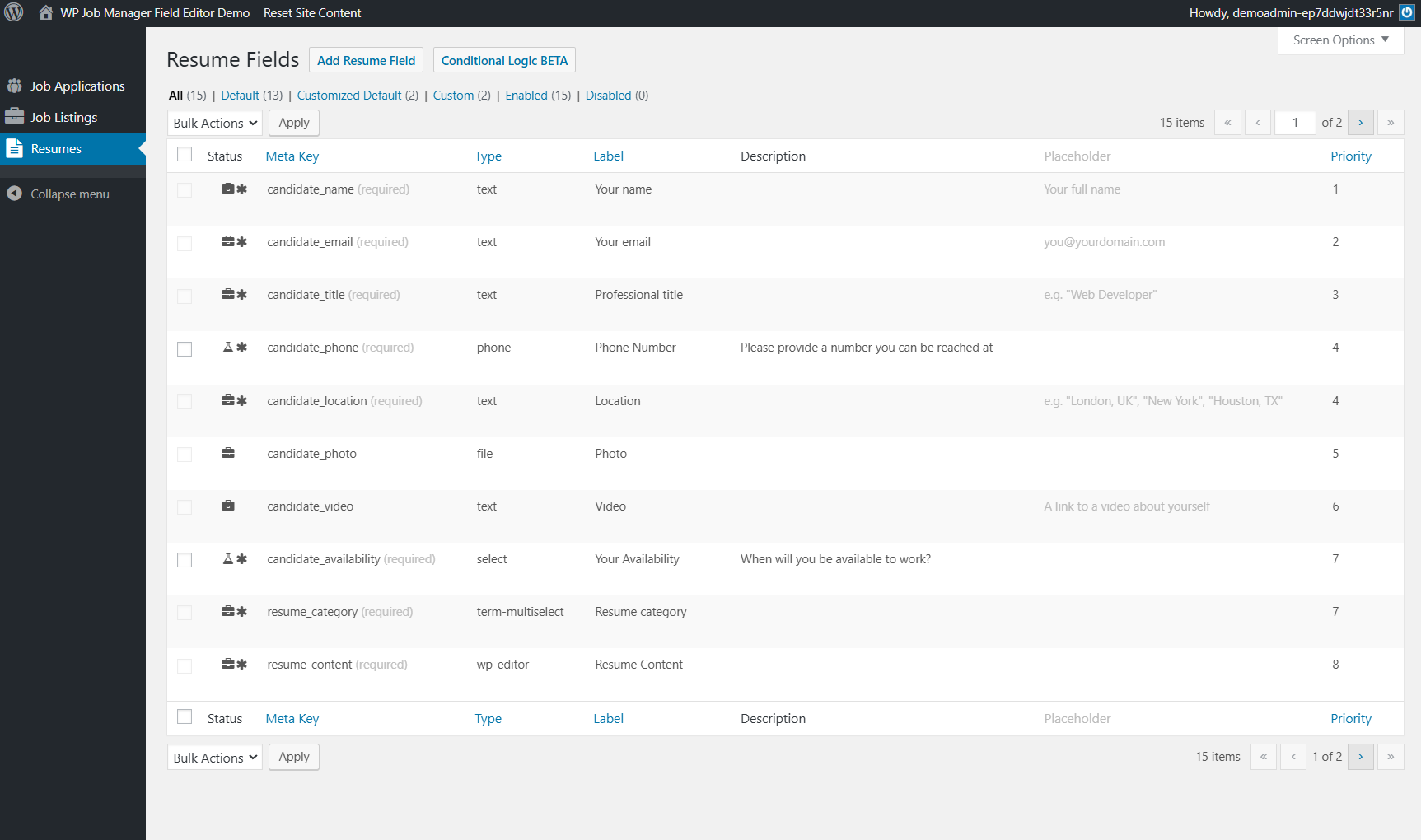 // Add field to admin add_filter( 'resume_manager_resume_fields', 'wpjms_admin_resume_form_fields' ); function wpjms_admin_resume_form_fields( $fields ) { $fields['_candidate_color'] = array( 'label' => __( 'Favourite Color', 'job_manager' ), 'type' => 'text', 'placeholder' => __( 'Blue', 'job_manager' ), 'description' => '', 'priority' => 1 ); return $fields; } // Add field to frontend add_filter( 'submit_resume_form_fields', 'wpjms_frontend_resume_form_fields' ); function wpjms_frontend_resume_form_fields( $fields ) { $fields['resume_fields']['candidate_color'] = array( 'label' => __( 'Favourite Color', 'job_manager' ), 'type' => 'text', 'required' => true, 'placeholder' => '', 'priority' => 1 ); return $fields; } // Add a line to the notifcation email with custom field add_filter( 'apply_with_resume_email_message', 'wpjms_color_field_email_message', 10, 2 ); function wpjms_color_field_email_message( $message, $resume_id ) { $message[] = "n" . "Favourite Color: " . get_post_meta( $resume_id, '_candidate_color', true ); return $message; }