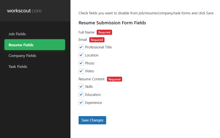 Basic changes can be done in WorkScout Core ā Form Fields Visibility ā Resume Fields where you can enable or disable fields you want in resume submit form.