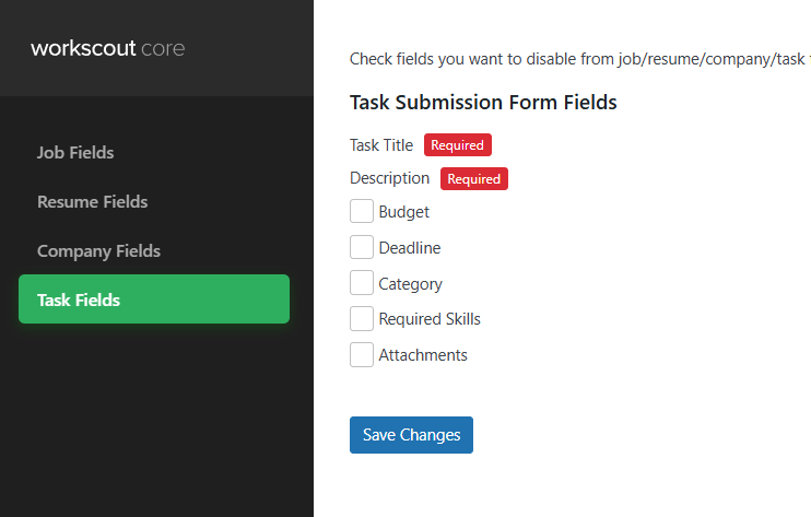 Basic changes can be done in WorkScout Core → Form Fields Visibility → Task Fields where you can enable or disable fields you want in company submit form.