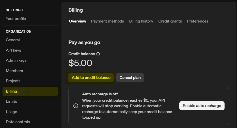 Go to Billing and click Add credits to balance