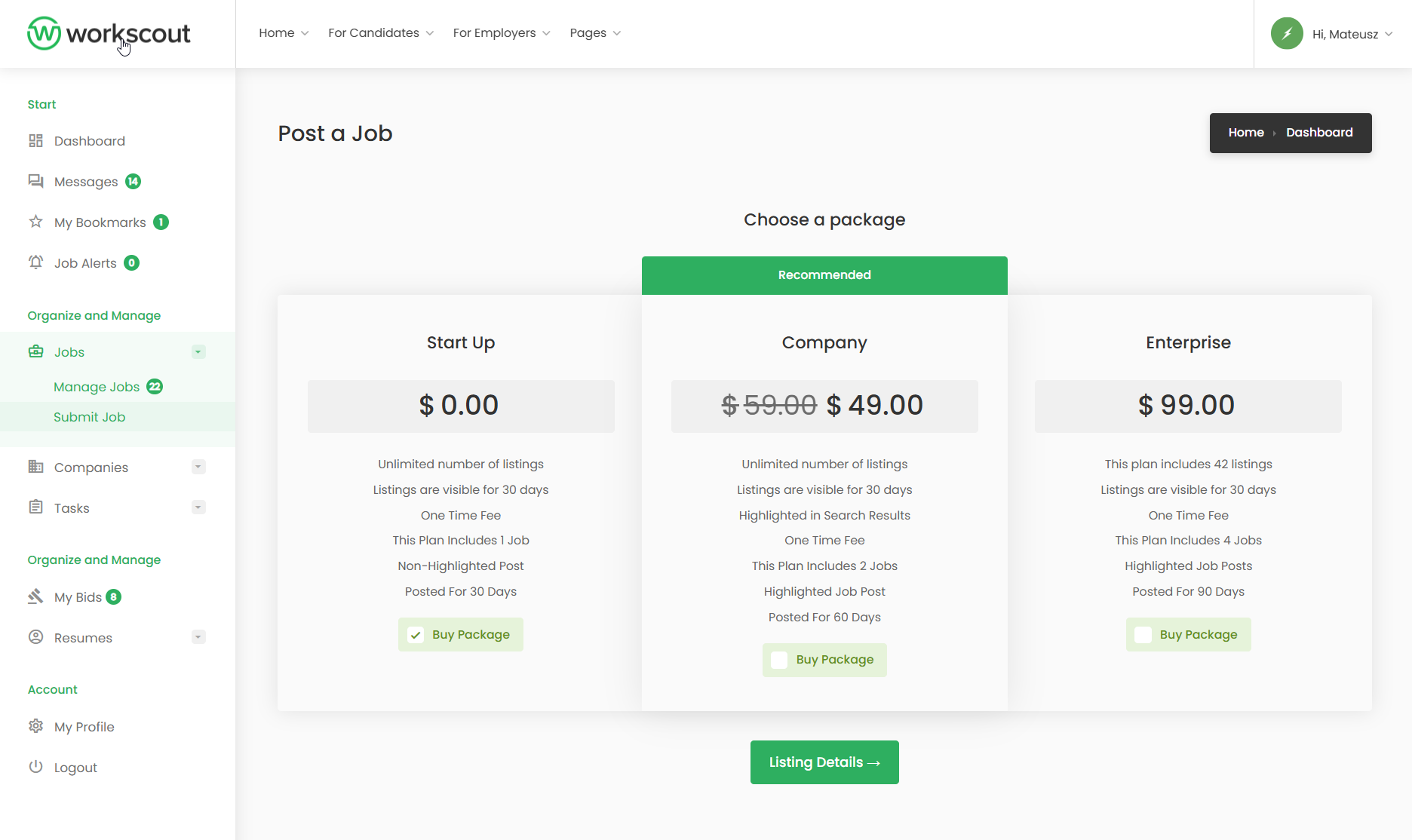- Then he choose a package screen will be displayed. This page lists all Job Package products and previously purchased active job packs: